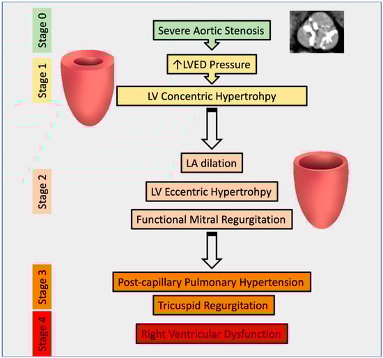 Pathophysiology of Aortic Stenosis by disease stage. In this figure, an illustration of the progression of AS is provided, with particular emphasis on the pathophysiological basis for the occurrence of functional mitral and tricuspid regurgitation.