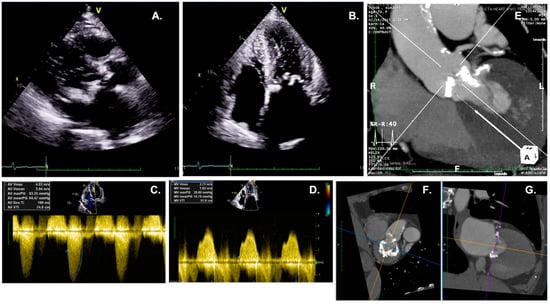 A case of concomitant severe AS and MS due to severe mitral annular calcification. (A,B). Representative echocardiographic images from parasternal long-axis view and apical 4 chamber. (C,D). Continuous wave Doppler on the AV and MV, showing high gradients. (E–G). CT images of this same patient help identify the distribution of calcium within the LVOT, aortic cusps, and mitral annulus. AS: aortic stenosis; MS: mitral stenosis; AV: aortic valve; MV: mitral valve; CT: computed tomography; LVOT: left ventricular outflow tract.