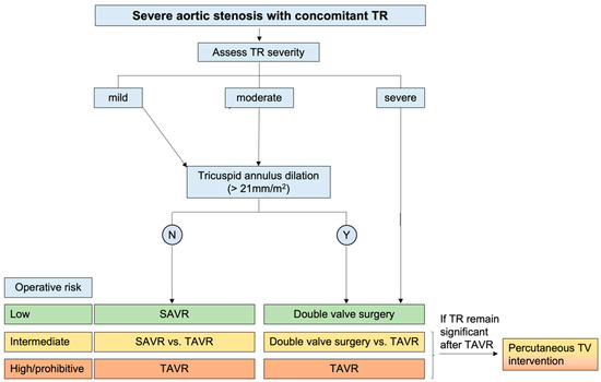 Concomitant significant secondary TR has been associated with worse outcomes in patients with severe AS in several observational studies [83]. Nevertheless, TR may be secondary to multiple conditions (such as atrial fibrillation, pulmonary hypertension, and RV dysfunction), which can have a per se negative impact on patient prognosis. Therefore, whether secondary TR is itself independently associated with a worse prognosis or is merely a surrogate marker of disease remains a matter of debate [76]. Moreover, the fact that TR severity is dynamic and varies with loading conditions has led to the conclusion that tricuspid annulus diameter (>21 mm/m2), which has been associated with TR worsening [84], rather than TR severity should be considered to decide whether concomitant TR should be treated at the time of AVR. To facilitate the decision-making process for both scenarios, a proposed algorithm (Figure 3 and Figure 4) that takes into account the severity of the regurgitation, morphological and hemodynamic factors, and the individual’s operative risk has been proposed [50,85,86].