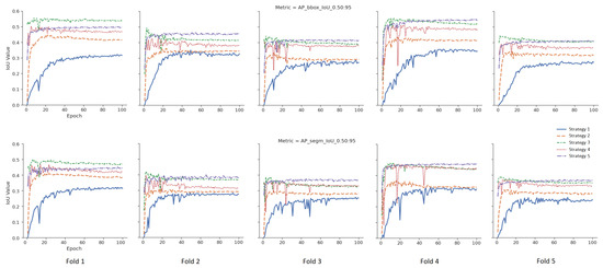 According to the mean values of the 5-fold cross-validation method, as seen in Figure 5 and Figure 6, Strategy 4 gives better bounding boxes and segmentation IoU values than other strategies. The bounding boxes and segmentation results are given below. Values in parentheses indicate the augmented pipeline training results. All cross-validation results for the bounding box are given in Table 3, and the segmentation is shown in Table 4.