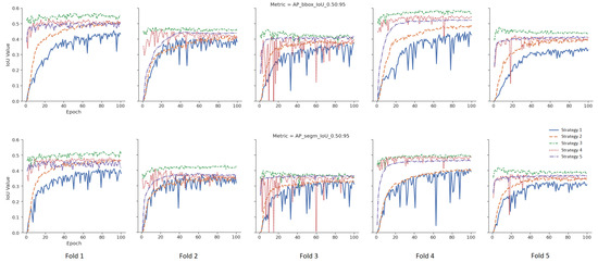 To measure the effect of five different weight initialization strategies determined within the scope of this study, the 5-fold cross-validation method was used, and the results were visualized. In Figure 5, models were trained without data augmentation. The upper part for the bounding box results and the lower part for the segmentation results are given in Figure 5 for the tumor class. The X-axis represents the epoch, and the Y-axis represents the intersection over union (IoU) value corresponding to the specified metric. In Figure 6, different from Figure 5, data augmentation is performed during training, and learning rate optimization is also performed using the learning rate finder. In Figure 5 and Figure 6, the metric for tumor class is used as the success metric for both the bounding box and segmentation results. The metric expresses the AP (average precision) for IoU thresholds from 0.5 to 0.95 by the step size of 0.05.
