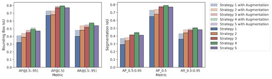 - When the strategies are examined according to the generally accepted value of IoU 0.5 in the literature, there is no difference between Strategy 1 and Strategy 2, as they are 73% vs. 73% for bounding boxes in the augmented pipeline. Additionally, the metric values of the segmentation are very close to each other as 73% vs. 74%. At the same time, the results for bounding boxes obtained from the default pipeline are also close to each other as 67% vs. 68%.
