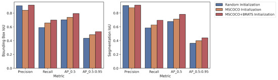 In addition, the proposed strategies were also tested using YOLOv8. YOLOv8 was used in Strategy 1 (random initialization), Strategy 2 (MS COCO), and Strategy 4 (MS COCO + BraTS), as its original implementation does not have a fine-tuning mechanism. Mean values of the 5-fold cross-validation method for both the bounding box and segmentation results are presented in Figure 8. The augmented pipeline training results are given below. As with the results obtained using Mask R-CNN, the best results with YOLOv8 were achieved with Strategy 4. All cross-validation results for the bounding box are given in Table 6, and the segmentation is shown in Table 7.