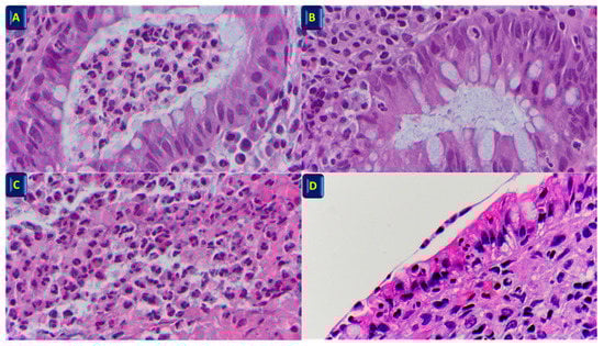 (A) Crypt abscess (hematoxylin–eosin dye). Magnification × 40; (B) Cryptitis (hematoxylin–eosin dye). Magnification × 40; (C) neutrophil infiltration in the lamina propria, intermingled with eosinophils (hematoxylin–eosin dye). Magnification × 40; (D) neutrophil infiltration in the surface epithelium (hematoxylin–eosin dye). Magnification × 40.