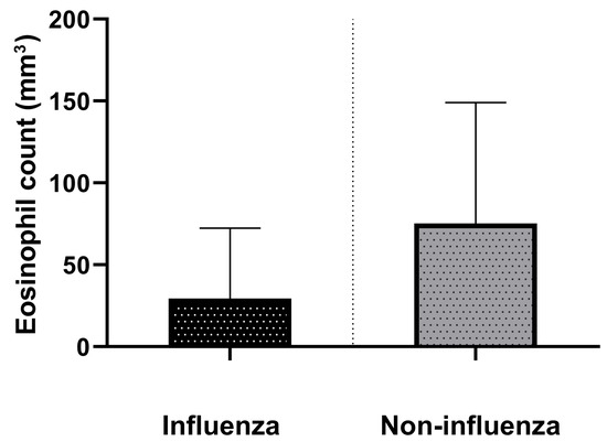 The reason why we observed a higher prevalence of absolute eosinopenia in influenza can be explained by the association of eosinopenia with the heightened systemic inflammatory response syndrome observed in influenza, whereas non-influenza viruses elicit fewer inflammatory cytokines, except for COVID-19 [24]. Furthermore, we took great care to avoid drawing the incorrect conclusion that eosinopenia is specifically associated with influenza, considering that influenza is prone to superinfection. However, the incidence of superinfection was comparable between both groups (p = 0.21), which mitigates the risk of overinterpretation. It is worth noting that the role of eosinophils in inflammation remains controversial; nonetheless, numerous studies conducted in animal models and humans have collectively demonstrated that eosinophils play diverse functional roles, exerting proinflammatory, inhibitory, and/or regulatory effects at sites of inflammation [25].