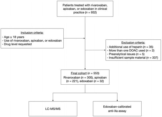 - Douxfils, J.; Adcock, D.M.; Bates, S.M.; Favaloro, E.J.; Gouin-Thibault, I.; Guillermo, C.; Kawai, Y.; Lindhoff-Last, E.; Kitchen, S.; Gosselin, R.C. 2021 Update of the International Council for Standardization in Haematology Recommendations for Laboratory Measurement of Direct Oral Anticoagulants. Thromb. Haemost. 2021, 121, 1008–1020. [Google Scholar] [CrossRef]