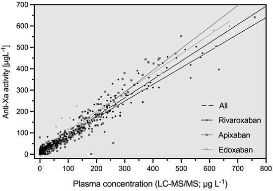 - Meihandoest, T.; Studt, J.D.; Mendez, A.; Alberio, L.; Fontana, P.; Wuillemin, W.A.; Schmidt, A.; Graf, L.; Gerber, B.; Amstutz, U.; et al. Accuracy of a Single, Heparin-Calibrated Anti-Xa Assay for the Measurement of Rivaroxaban, Apixaban, and Edoxaban Drug Concentrations: A Prospective Cross-Sectional Study. Front. Cardiovasc. Med. 2022, 9, 817826. [Google Scholar] [CrossRef]