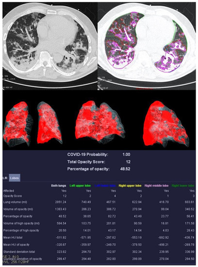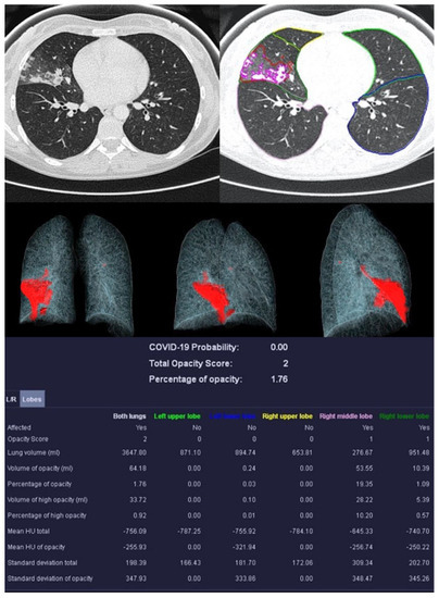 In addition to the PO, PHO, LSS, and LHOS described above, the quantitative analysis calculates the probability of the presence of COVID-19 pneumonia, called the “COVID-19 Probability”. All volumes (whole lung, individual lung lobes, diseased tissue) are expressed as percentages and in milliliters. Average densities of whole lungs, lobes, and COVID-19 suspect areas are reported in Hounsfield units (HU).