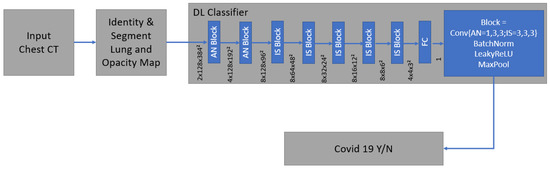 As an input, we considered a two-channel 3D tensor with the first channel containing directly the CT Hounsfield units within the lung segmentation masks and the second channel containing the probability map of a previously proposed opacity classifier [28,31]. Accordingly, the network uses anisotropic 3D kernels to balance resolution and speed with deep blocks that gradually aggregate function to a binary output.
