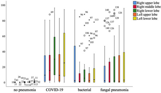 Overall, it can be seen that patients with COVID-19 pneumonia show significantly higher levels of affected tissue in all parts of the lung, with the exception of the right upper lobe, which is equally affected in patients with bacterial pneumonia. A significant difference in the affected lung lobes between pathologies was revealed using the one-way multivariant ANOVA, p < 0.001 (Figure 9).