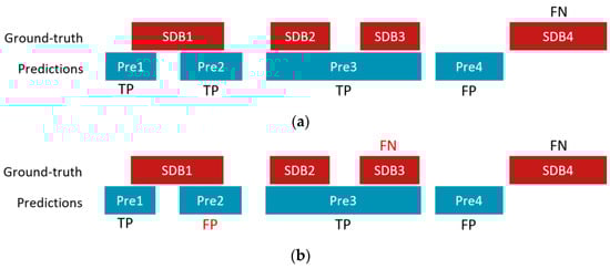 An illustrative example of a hypothetical scenario of counting TP, FP, and FN with four ground truth SDB events (SDB1, SDB2, SDB3, and SDB4) and four detected/predicted events (Pre1, Pre2, Pre3, and Pre 4) using (a) rules by Olsen et al. [] and (b) rules used in this work. In this example, Pre2 is counted as a TP according to Olsen’s rules, while it is considered as an FP in this study; SDB3 is considered correctly detected according to Olsen’s rules, but it is treated as an FN based on our rules.