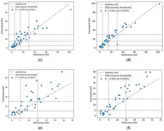 For AHI estimation, a Bland–Altman analysis between the estimated AHI (AHIest) and reference (AHIref) is presented. AHIref was derived from the ground truth SDB events annotated from PSG. In addition, scatter plots (i.e., estimated versus reference values), the corresponding Spearman’s correlation coefficient R, and the intraclass correlation coefficient (ICC) [,], using two-way random-effects model for measuring the agreement between two scorings, are provided. Because most patients in our cohort did not have a very large AHI value (>30) and the correlation analysis can be very sensitive to just a few large values, we also calculated correlation coefficients for subjects with an AHI less than 30.