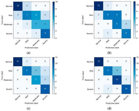 Confusion matrix of SDB severity classification based on AHI: (a) RR + EDR without NBL, (b) RR + RE without NBL, (c) RR + EDR with NBL, and (d) RR + RE with NBL. Note that PSG-based sleep information was used for AHI estimation.