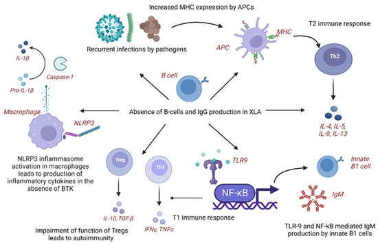 In XLA, patients develop subclinical infections leading to chronic inflammation and immune dysregulation. In response to infectious organisms, the expression of major histocompatibility complex (MHC) antigens increases via molecular mimicry on antigen-presenting cells (APCs), leading to T helper type 2 (T2) immune response and production of cytokines, including interleukins (IL-4, IL-5, and IL-10). The immune system shifts towards an autoimmune phenotype with aberrant B-cell function [8]. Additionally, overactive toll-like receptor-9 (TLR-9) and nuclear factor-kappa B (NF-κB)-mediated immune stimulation leads to the production of natural immunoglobulin M (IgM) antibodies from innate B-1 cells and T1 type of immune responses. The impairment of Tregs could also explain this association of KD in XLA [8]. Autoimmune mechanisms that may play a role in the pathogenesis of KD in XLA include leaky antibody production, defective BTK signaling leading to abnormal myeloid maturation and aberrant toll-like receptor (TLR) signaling, and autoreactive T cells [10]. XLA has been associated with inflammatory diseases with elevated levels of tumor necrosis factor- α (TNF-α) and interleukins (IL-10, IL-6, and IL-1α) secreted by peripheral blood mononuclear cells (PBMCs). The activity of inflammasome, nucleotide-binding domain, leucine-rich–containing family, and pyrin domain–containing-3 (NLRP3) activity is impaired in XLA as BTK is a regulator of NLRP3. Some infections, such as Pseudomonas aeruginosa, are found to be a common feature of XLA and infection-triggered KD [7].