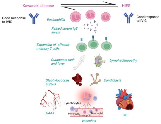 Clinical and laboratory features shared between Kawasaki disease and hyper IgE syndrome. CAAs: Coronary artery abnormalities, HIES: Hyper IgE syndrome; IgE: Immunoglobulin E; IVIG: Intravenous immunoglobulin; MI: Myocardial infarction. Created with BioRender.com https://www.biorender.com (accessed on 20 June 2023).