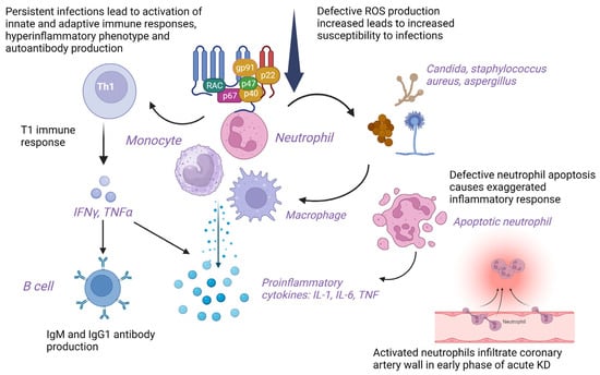 NADPH-oxidase deficient T cells in CGD show skewed T1 immune response with the production of T1 cytokines leading to autoimmunity [39]. Polyclonal hypergammaglobulinemia and autoantibody production are reported in patients with CGD and murine models, respectively [40]. Defective apoptosis of neutrophils and inefficient clearance of apoptotic debris in CGD may result in an exaggerated inflammatory response [40]. The ineffective removal of microbial pathogens and their antigens causes autoimmunity. Candida albicans and Staphylococcus aureus are common pathogens associated with KD and CGD [19]. Activated neutrophils infiltrate the coronary arteries with higher granulocyte-colony stimulating factor (G-CSF) levels detected in patients with CAAs than in patients without CAAs in the early phase of KD eliciting vasculitis due to mechanisms other than reactive oxygen species (ROS) generation. However, incomplete KD in CGD could be due to defective ROS production by neutrophils [19]. Predisposition to infections in CGD may delay the diagnosis of KD and cause vascular damage [20]. Insufficient ROS production in hyperactivated neutrophils and monocytes reduces immunoregulatory response leading to skewing of the immune system towards hyperinflammatory phenotype that may lead to KD. T cells are hyperactivated in CGD, evident by sustained elevation of soluble interleukin-2 receptor (sIL-2R) levels, leading to poor response to initial high-dose IVIG therapy [21]. Non-functional residual ROS generation leads to ineffective microbial clearance and persistent infection, triggering an abnormal immune response in AR-CGD. Activation of innate immunity and neutrophils with the release of proinflammatory cytokines such as interleukins (IL-1, IL-6) and TNF and activation of signaling pathways in CGD leads to an overwhelming immune response predisposing to KD [22] (Figure 3).