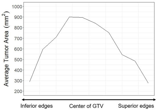 The average distribution of tumor area on a CT slice from the middle of the tumor to the superior and inferior edges. The area decreases as slices move away from the middle. These slices with low areas also correspond to slices with low performance in baseline models.