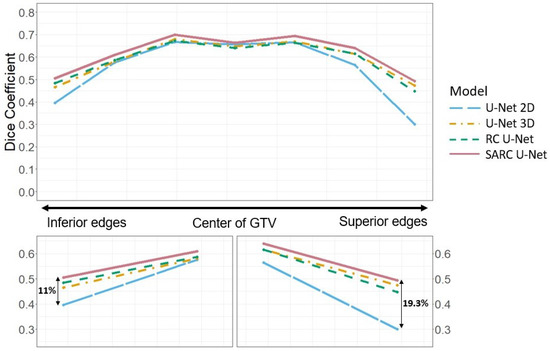 The third research objective of this work is to demonstrate that SARC U-Net will (1) increase the overall Sørensen–Dice coefficient (DSC) of proposed GTVs, and (2) increase the DSC at the top and bottom tumor edges (in the axial direction) of the GTV. Further, our goal is to increase accuracy with little addition to computational overhead, as models that take adjacent slices into context such as the 3D U-Net employ a high number of trainable parameters.