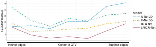 The Hausdorff distance is another performance metric commonly used for segmentation performance. Figure 9 shows the Hausdorff distance by slice distance from the middle of GTV. When comparing Hausdorff distances, the SARC U-Net outperforms all architectures at all slice locations.