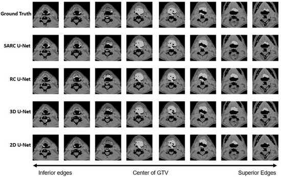 For the GTV volumes, the U-Nets that use SARC blocks show a significant increase in performance, with a DSC of 0.572 compared with 0.551 for the 3D architectures, 0.553 for the 2D architectures, and 0.544 for the RC architectures. This is comparable to the results found in Andrearczyk et al. [16], where there were small differences in DSC between the 2D and 3D architectures. In part, this is due to how DSC is calculated over the full volume, giving a high accuracy if the large (more obvious) portions of the tumor are captured. While the 2D U-Net shows a decrement in performance when DSC is averaged over all slices, Figure 8 shows this is because of poor performance at the top and bottom edge slices, which have less weight when computing DSC over the volume because they also take up a smaller proportion of the total tumor volume, as shown in Figure 3. The SARC U-Net, however, is designed to improve performance at the edge slices and increases both the total volumetric DSC and 2D DSC.
