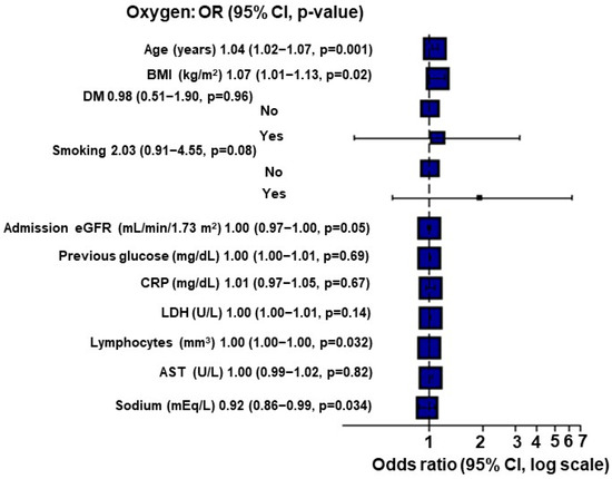 To further substantiate our findings, we also performed a linear regression model using BMI as a continuous and dependent variable (Tables S6 and S7). BMI was also a risk factor for O2 requirement (OR = 1.27, p = 0.03; Table S7) in KTRs.