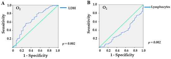 Sensitivity and specificity of laboratory markers in overweight/obese KTRs with COVID-19 and need for supplemental O2: (A) LDH (lactate dehydrogenase; p = 0.002), and (B) lymphocytes (p = 0.002), the green line is the reference line.