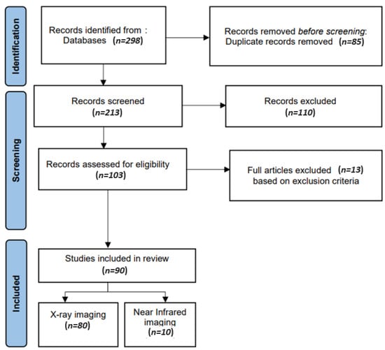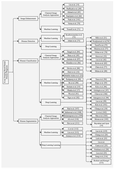 The materials and methods involved in the study selection process are provided in Section 2. The imaging systems and challenges encountered in processing them for dental diagnosis are briefly explained in Section 3. The public benchmark datasets available for disease diagnosis along with the evaluation metrics are detailed in Section 4. An inclusive account of the machine- and deep-learning approaches for disease diagnosis is provided in Section 5 and Section 6, respectively, while Section 7 focuses on identifying gaps in research alongside future directions. Finally, Section 8 concludes the review.