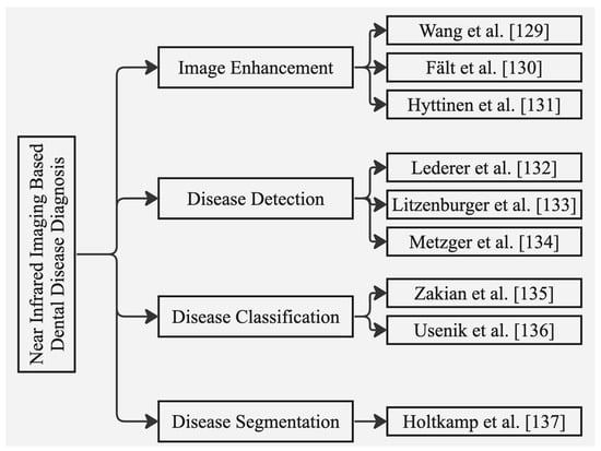 Several automated systems have been explored in recent times for the dental diagnosis process [,,,,,,]. However, certain issues need to be addressed including limited datasets, class imbalance, limited generalizability, lack of transparency, and interpretability. Another concern is the lack of external validation. Similarly, machine- and deep-learning techniques have not been utilized to their full potential to be integrated into routine dentistry. Additionally, there are certainly ethical considerations that need to be taken into account. Current state-of-the-art approaches still require improvement to tackle the challenges mentioned above. Hence, this survey aims to provide an in-depth analysis of X-ray and near-infrared image-based dental disease diagnosis. Moreover, the identified research gaps and future research directions are discussed thoroughly in the following sections.