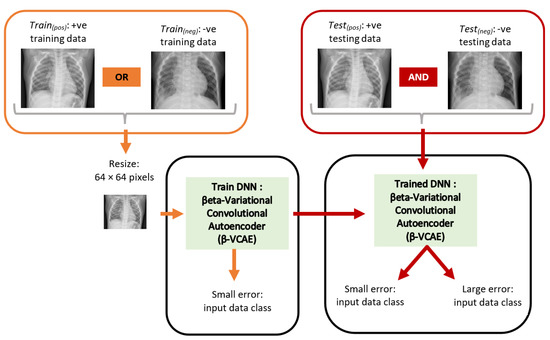 Proposed unsupervised framework for the diagnosis of pneumonia using chest X-ray. The orange items and red items show the training and testing paths, respectively. The DNN is trained using only data from Train(pos) or Train(neg), while the model is tested using data from both Test(pos) and Test(neg).