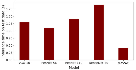Finally, the comparison of our best results obtained using β-VCAE with supervised models is considered. Namely, popular supervised DNNs such as the VGG-16, ResNet-56, ResNet-110, and DenseNet-40 are used for the study. The results, including the number of model parameters and depth, are shown in Table 7, where the β-VCAE models are trained using Train(pos) settings, and thus, the results are taken from Table 4. The supervised models are trained and tested by combining the same positive samples used for β-VCAE and the negative samples in Table 2. It is seen in Table 7 that the supervised models slightly outperform the proposed β-VCAE models that are unsupervised. However, when the different costs associated with collecting labeled data for training are taken into consideration, our unsupervised models are competitive and can be successfully employed for the diagnosis of pneumonia using chest X-rays. The training curve for β-VCAE with β = 5, which is reported in Table 7, is given in Figure 4. Furthermore, in comparison to the supervised models, the proposed models have significantly fewer layers and parameters, and thus, training the β-VCAE model is many times faster than the supervised models. Importantly, the inference times of the different models are especially important, since these reflect the maximum number of diagnoses that can be made within a given period. As such, the inference times of the different models are shown in Figure 5. It is observed that the proposed β-VCAE model has significantly smaller latency during testing compared to the supervised models. This is an additional advantage for the proposed model in comparison to the supervised models.
