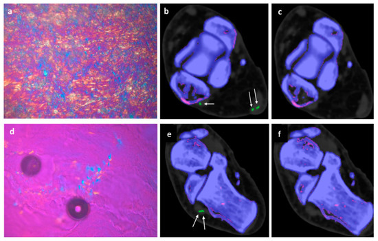 77 year-old-male fresh cadaver. (a) Polarizing light microscopic evaluation of a sample taken from achilles tendon, showing large diffuse packed and patchy MSU crystals with strong negative birefringence (bluish structures). (b) Corresponding DECT 120 image showing large MSU deposits in the achilles tendon (large white arrows) and one small MSU deposit (small white arrow) in peroneus tendon. (c) Corresponding DECT 150 image without evidence of MSU deposits in the achilles and peroneus tendon. (d) Polarizing light microscopic evaluation of a sample taken from peroneus tendon, showing diffuse packed and patchy MSU crystals with strong negative birefringence (bluish structures). (e) Corresponding DECT120 image showing MSU deposits in peroneal tendons (white arrows). (f) Corresponding DECT 150 image without any MSU deposits in peroneal tendons.