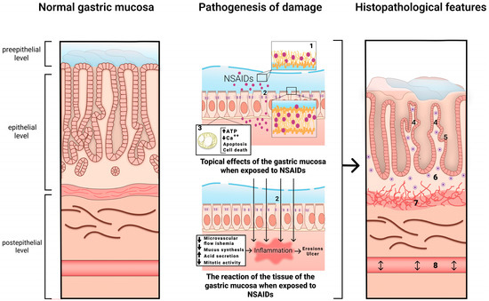 The direct (topical) interaction between NSAIDs and phospholipids and the uncoupling of oxidative phosphorylation in mitochondria cause cell membrane damage, with a disruption of the phospholipid layer and tight junctions. This action increases transcellular permeability. The inhibition of COX, as a systemic effect, reduces microvascular blood flow, and luminal aggressive factors modify and amplify this reaction, leading to inflammation, erosions and ulcers [9].