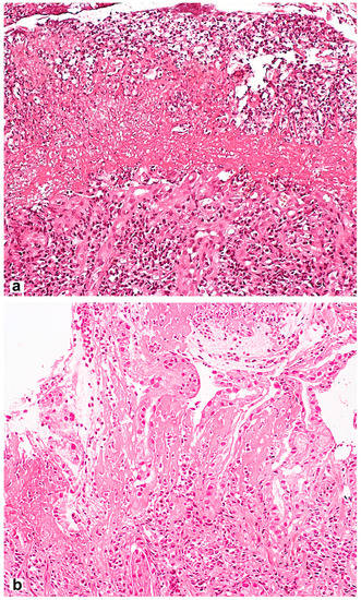 Differential diagnosis between NSAID-associated lesions and a defect caused by Helicobacter pylori. (a) Helicobacter pylori-associated gastric erosion. Inhomogeneous masses of fibrinoid necrosis with cell debris and granulocytes. (b) NSAID-associated gastric erosion. Homogeneous eosinophilic ischemic necrosis blending into the adjacent lamina propria. Hematoxylin and eosin stain ×200.