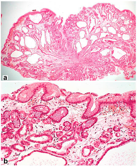 Microscopic signs comprise the picture of the so-called reactive gastropathy, which is not strictly specific to NSAIDs. There is a weak–diffuse, predominantly mononuclear inflammatory infiltration of the lamina propria, often revealing erosive and/or ulcerative defects, pronounced regenerative changes in the epithelium (foveolar hyperplasia with hyperchromic cell nuclei, decreased mucus formation), mucosal edema with vascular ectasia in the lamina propria and lamina propria expansion with fibromuscular proliferation. Subnuclear vacuolated mucous cells may be an additional criterion, which is associated with operated stomach syndrome. Interestingly, the nature of the necrotic masses at the bottom of the defect may be the starting point for the differential diagnosis between NSAID-associated lesions with a homogeneous eosinophilic zone of necrotic masses and a defect caused by Helicobacter pylori (H. pylori) [28] with the presence of necrotic masses that are loosely associated with the lamina propria, with immured fragments, necrotic cells and neutrophilic leukocytes (Figure 2). NSAID exposure, in very rare cases, is accompanied by the formation of diaphragms (diaphragm disease) in the stomach. This phenomenon is more typical of damage to the small and large intestines.