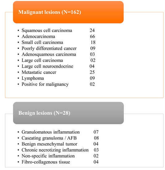 The study included 190 consecutive patients who underwent percutaneous metabolic biopsies and were sent to our department after previous anatomical biopsies yielded negative results. Table 1 provides a complete summary of patients’ demographics, clinical features, and pathological findings. The average age of the patients was 52.5 (in a range of 7 to 80) years. Among the samples collected during metabolic biopsies, the lung lesions comprise the biggest cohort, followed by lymph nodes and soft tissue lesions, respectively; details of sites of biopsy are provided in Figure 1. Except for two individuals, sufficient samples were acquired from all patients. These two individuals received positive diagnoses of cancer but inadequate material for further IHC characterisation. Histopathological study reveals that 162 (85%) of the lesions were malignant and 28 (15%) were benign (Figure 2), including inflammatory cells, necrotic tissue, and infection. The patients with benign results were appropriately treated based on histology findings and monitored for at least 6 months to rule out disease development. Four biopsies (2.1% of total) yielded non-specific results and were deemed non-diagnostic. The overall diagnostic yield of metabolic biopsy in our study was 96.9%. Among the 190 metabolic biopsies performed in our study, the rate of complications (major and minor) was 13.1% (25 patients), with the greatest number occurring in patients with lung lesions (21 patients). Two individuals had life-threatening complications that contributed to their deaths (one individual had a large perihepatic hematoma and the other individual had large volume haemoptysis). The patient with severe haemoptysis had numerous coexisting morbid conditions.