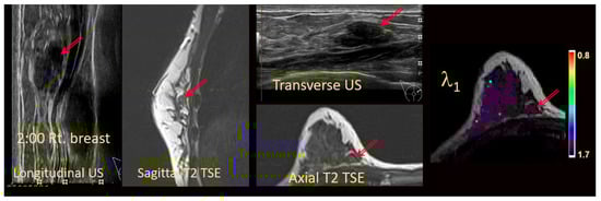 Diffusion-weighted imaging (DWI) has been shown to reduce the number of unnecessary biopsies indicated by DCE-MRI [10]. Much of the current literature on DWI uses quantitative analysis to characterize lesions, and a threshold value of 1.5 × 10−3 mm2/s for the apparent diffusion coefficient (ADC) is widely accepted as a value below which a lesion is considered to be suspicious for malignancy [10,13,14,15]. A variant of DWI is diffusion tensor imaging (DTI), which can characterize the directional changes in diffusion coefficients [16]. DTI affords multiple quantitative parameters, including the highest principal diffusion coefficient (λ1), maximal anisotropy (λ1–λ3), and mean diffusivity, also termed the apparent diffusion coefficient (MD/ADC), all of which have the potential to better characterize breast lesions [17,18]. Of note, given that the λ1 is higher in magnitude than the ADC, the threshold value for this parameter is slightly higher, 1.7 × 10−3 mm2/s. Additionally, DTI data can be displayed in the form of color-coded parametric maps that can help highlight breast lesions [17,19,20,21]. To date, studies have suggested that DTI may become a successful strategy for improving the specificity of breast MRI [22,23,24].