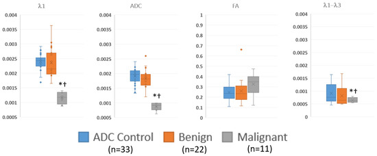 Summary of ROI measurements of diffusion tensor measurements in visible benign, and malignant lesions and control regions away from the lesions via box and whisker plot. λ1, MD/ADC, and λ1–λ3 have units of mm2/s. * p < 0.05 compared to control; † p < 0.05 compared to benign.
