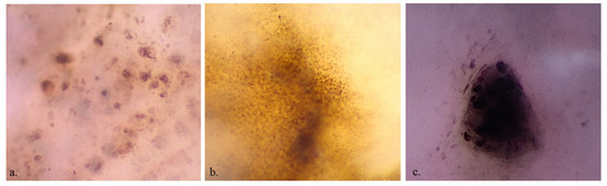 The D400 variables were those described in the previous pilot study [7,8]: the presence of the pigmented cells and their features, out-of-focus blue or grey/brown structureless areas, vessels, angled nests, and networks with or without edged papillae. Pigmented cells were differentiated into keratinocytes (seen as regular polygonal brown mostly in-focus cells, evenly spread and/or inside a network), roundish melanocytes (seen as large roundish brown-to-violet/blue scattered cells—cells were defined as “large” when they were larger than keratinocytes), dendritic melanocytes (dendritic brown-to-violet/blue scattered cells), and melanophages (large blue-to-violet non-in-focus cells with a not defined polymorphous shape). Considered cell features were cell color (violet and blue colors are difficult to differentiate with D400 and were considered together, while light and dark brown were also considered together because brown is often present with multiple shades in the same structure), shape and size irregularity of melanocytes, and irregular arrangement of single melanocytes.