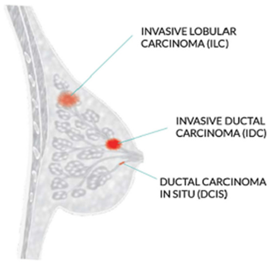 The WHO recommends mammography screening for breast cancer in developed countries where individuals have access to resources and are concerned about their health. Women between 50 and 69 who are well-educated and resourced should periodically get a routine exam. Mammography is not as good and economical in underdeveloped nations with few resources and poor health conditions. Increasing knowledge of that can help with the early diagnosis of breast tumors [3]. Invasive ductal carcinoma, ductal carcinoma in situ, and invasive lobular carcinoma are the three most prevalent kinds of breast cancer, as shown in Figure 1.