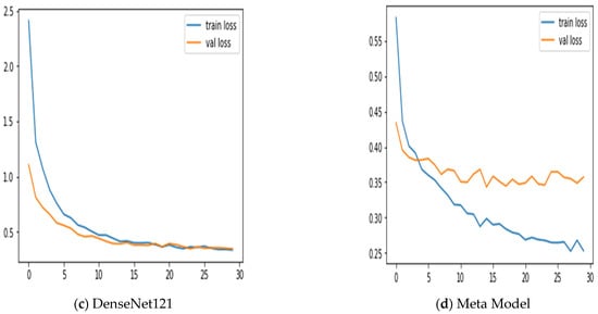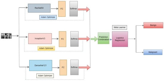 In this approach, we propose as shown in Figure 4 below, three novel CNN architectures—ResNet50, DenseNet121, and InceptionV3—ensembled in our proposed methodology. Neither of them employed the latest developments in the meta-learning technique to classify benign and malignant in the literature review. An optimizer is used to change the model’s learning rate. In this research, the Adam optimizer is utilized. The training accuracy score is evaluated using the accuracy measure. To identify the loss, binary cross-entropy is used. In binary class classification, this is the loss function that is most frequently utilized. The model performs better when the loss score goes down. Each model’s output is given to the meta-learner. We use a logistic regression classifier as a meta-learner to make our final prediction.