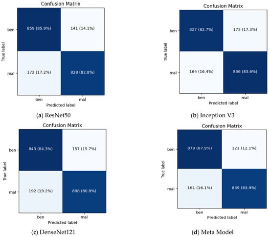 In our proposed meta-model: The proposed meta-model outperformed the individual CNN models regarding accuracy, precision, recall, and F1 score. The results for the meta-model are as follows.