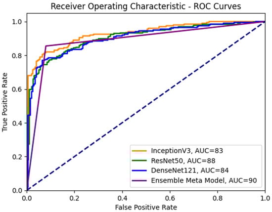 To enhance our understanding of the class distinction in the investigated meta-models, we employ receiver operating characteristic (ROC) curves, as depicted in Figure 8. An ROC curve plots the true positive rate (TPR) against the false positive rate (FPR), using a range of threshold values derived from the probability outcomes of deep learning models. TPR is indicative of the probability of accurately classifying benign images as malignant. In contrast, FPR represents the risk of false alarms, which is the scenario where a benign image is incorrectly classified as showing symptoms of malignancy.
