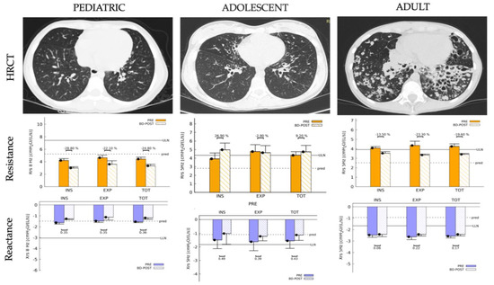 Figure 2 presents three cases, a 14-year-old female pediatric patient (Case G) HRCT scan with minimal bibasilar bronchiectasis and normal Rrs and Xrs, an adolescent patient (Case E) with HRCT showing moderate bronchiectasis with increased Rrs and normal Xrs, and an adult patient (Case F) HRCT scan that shows severe bibasilar cylindrical bronchiectasis with increased Rrs and Xrs. No significant changes in Rrs or Xrs were observed post-bronchodilator in the pediatric or adult cases.
