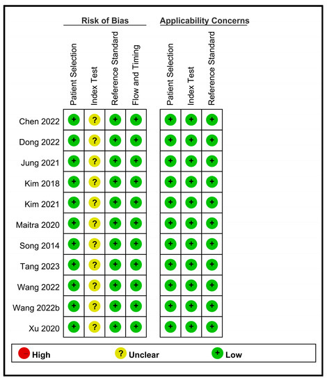 Figure 2 provides a comprehensive overview of the risk of bias and applicability concerns of the 11 included studies. Regarding the four domains pertaining to the risk of bias, all studies were regarded as having a low risk of bias in the domains of patient selection, reference standard, as well as flow and timing. However, all studies were considered to have some concerns in relation to the domain of the index test. Focusing on applicability concerns, all studies were regarded as having a low risk in the three domains of patient selection, index test, and reference standard.