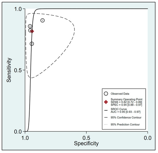 To assess the effectiveness of FTc for predicting the risk of perioperative hypotension, a meta-analysis was conducted using data from four relevant studies [23,24,29,30]. The analysis yielded a pooled sensitivity of 0.82 (95% CI: 0.72 to 0.89, I2 = 48.9%) and a pooled specificity of 0.94 (95% CI: 0.88 to 0.97, I2 = 0%) for FTc as a predictive tool, as demonstrated in Figure 3. Furthermore, the pooled AUC was 0.95 (95% CI: 0.93 to 0.97) (Figure 4).
