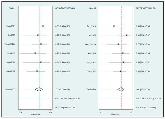 Forest plot demonstrating the pooled sensitivity and specificity of respirophasic variation in carotid artery blood flow peak velocity (ΔVpeak) for predicting perioperative fluid responsiveness [19,21,24,31,34].