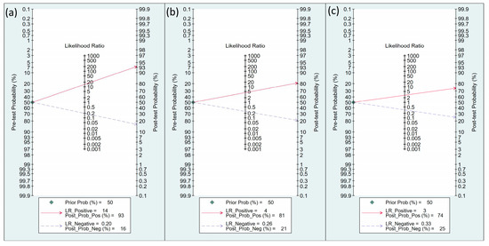 The efficacy of FTc as a predictor of perioperative hypotension and fluid responsiveness was evaluated using Fagan nomograms. Focusing on perioperative hypotension, the positive and negative likelihood ratios were 14 and 0.2, respectively. Assuming a pre-test probability of 50%, the introduction of FTc as a diagnostic test resulted in post-test probabilities of 93% for a positive result and 16% for a negative result (Figure 9a). Similarly, for the prediction of perioperative fluid responsiveness, the positive likelihood and negative likelihood ratios of FTc were 4 and 0.26, respectively, based on Fagan nomograms. Assuming a pre-test probability of 50%, the post-test probabilities of the event were 81% for a positive result and 21% for a negative result (Figure 9b). On the other hand, the use of ΔVpeak as a predictor of perioperative fluid responsiveness showed a positive likelihood ratio of 3 and a negative likelihood ratio of 0.33. Assuming a pre-test probability of 50%, the use of Δvpeak as a diagnostic test yielded post-test probabilities of 74% for a positive result and 25% for a negative result (Figure 9c).