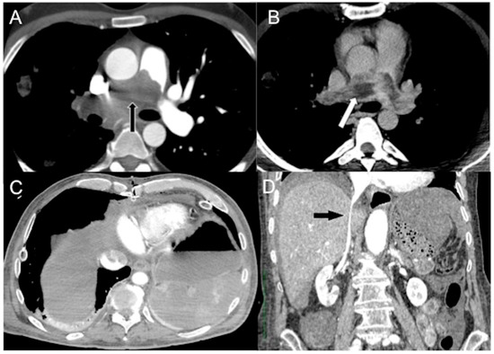 CECT images in obstructive shock in a severely dyspneic 28-year-old man with malignant pulmonary artery sarcoma. Arterial (A) and delayed (B) phase axial images show massive pulmonary trunk (black arrow) and right main artery (white arrow) soft tissue mass obstruction. A more caudal (C) axial image shows CM stasis in right cardiac chambers, no hepatic enhancement, and mild pleuropericardial effusion. (D) Delayed phase (delay of 200 seconds after CM injection) coronal reconstruction shows a thinned flat IVC (black arrow).