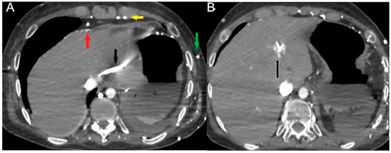 CECT axial images in an acutely dyspneic 64-year-old man with SVC obstruction from right lung cancer (not shown) and obstructive shock. Arterial phase (A) shows CM reflux via the larger subcutaneous (green arrow), pericardiophrenic (red arrow) and internal thoracic veins (yellow arrow) to the left hepatic vein (black arrow) generating (B) focal hot spot sign in left liver (black arrow).