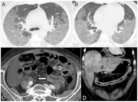Distributive septic shock in a 61-year-old male admitted to the emergency department with high fever (39 °C) and sepsis (score for sepsis, qSOFA 3) due to COVID-19 pneumonia (respiratory rate 27/min, systolic blood pressure 75 mmHg, altered mental status). (A,B) Unenhanced chest CT axial images (lung window) show bilateral parenchymal ground-glass opacities due to a diffuse alveolar damage (DAD) pattern; note mild right pneumothorax. (C) CECT axial image in the portal venous phase shows mural thickening (white empty arrow) and mucosal hyperenhancement of the small bowel (white arrow). (D) CECT coronal reconstruction in the portal venous phase shows abnormal wall thickening/enhancement in the partially collapsed transverse colon. Note associated heterogeneous liver enhancement and enhanced thickened pericardium with pericardial effusion (pericarditis).